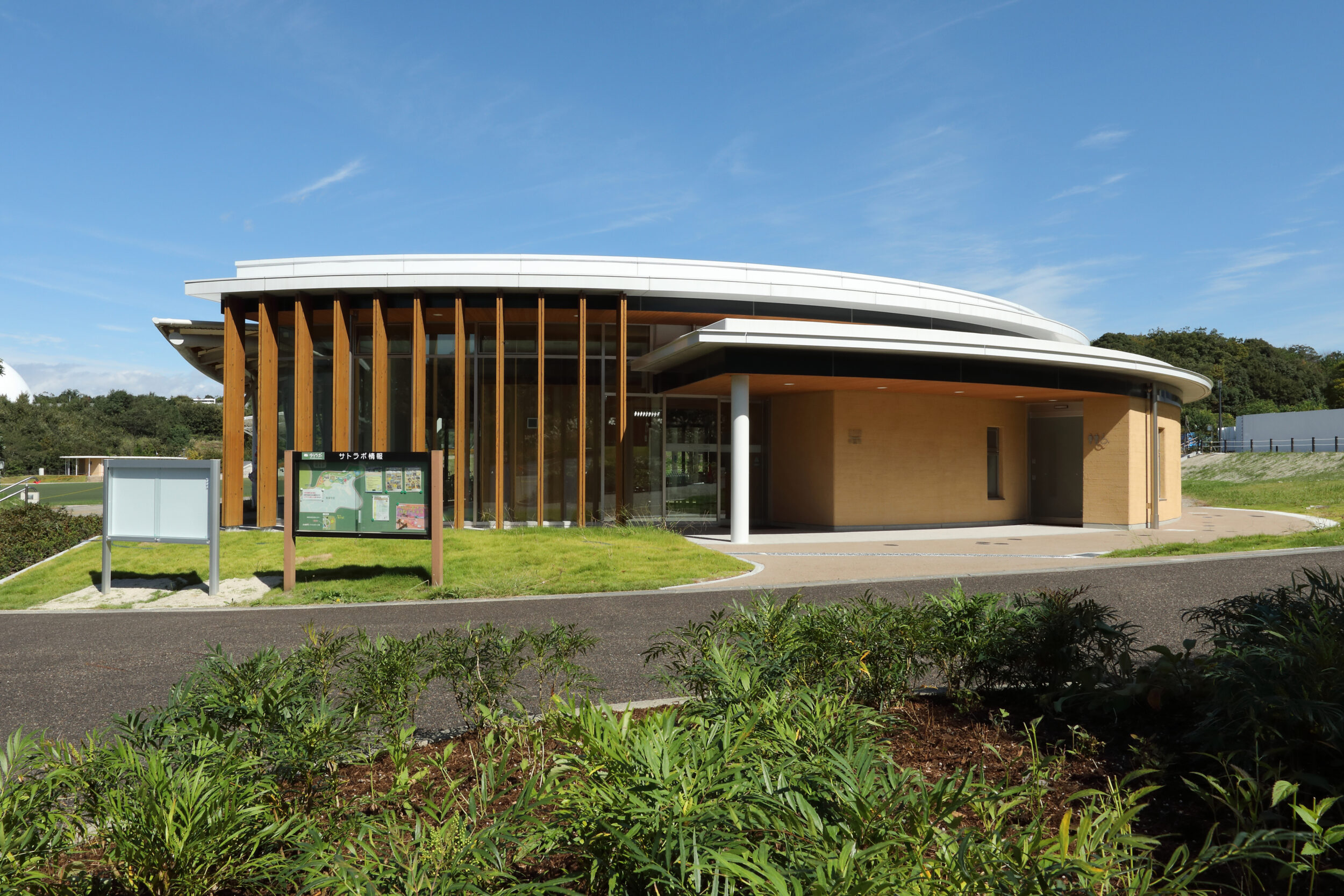 隣接する三日月形状の既設テント屋根と合わせ、建物は2枚の三日月の形をした屋根が重なる構成として、まとまりが感じられる配置とした。外部の大型木製ルーバーや軒天、内部の天井・壁の羽目板等に愛知県産材を使用し、地域に根差した建築としている。
